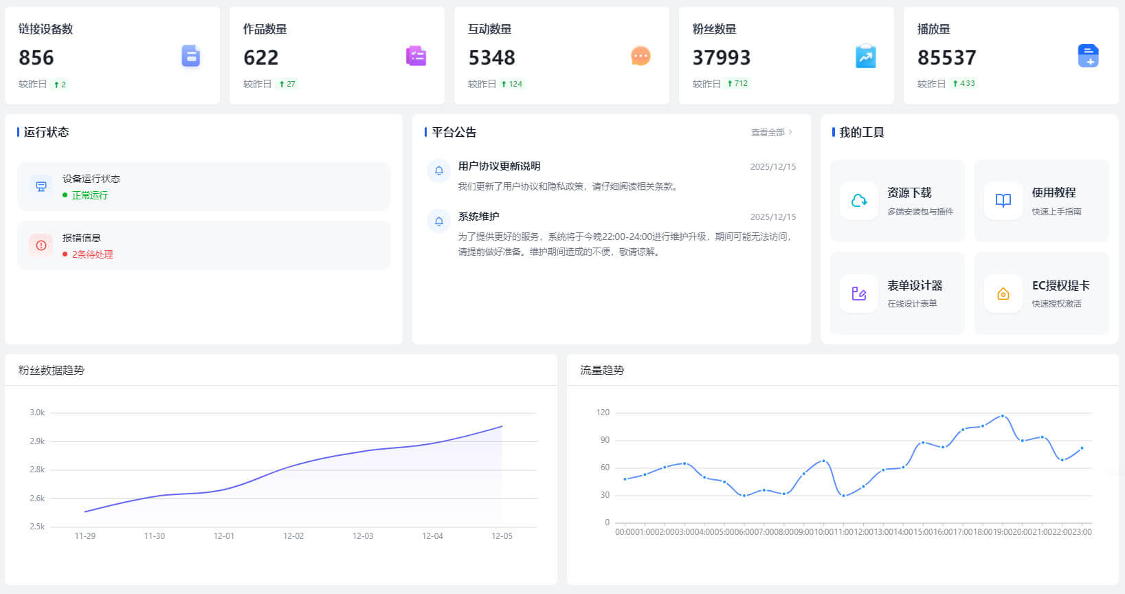实时展示播放、点赞、粉丝及任务执行数据,并可智能监听热点与博主,自动采集素材并二次创作发布。